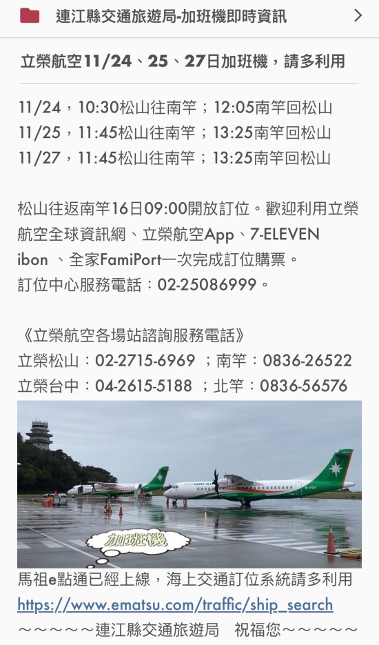 立榮11/24、25、27日加班機 --閱讀人次 : 1434 11/24,10:30松山往南竿;12:05南竿回松山