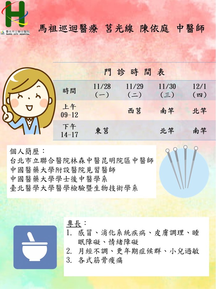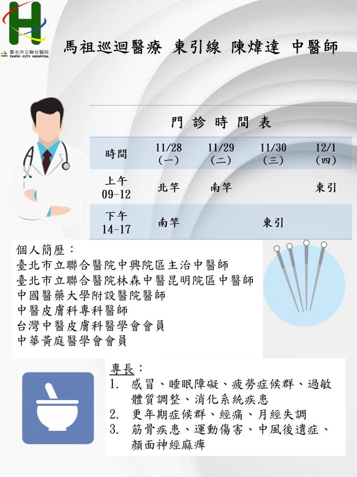 馬祖中醫巡迴醫療111/11/21-11/24 由莒光線 陳依庭醫師、東引線 陳煒達醫師前往支援服務。