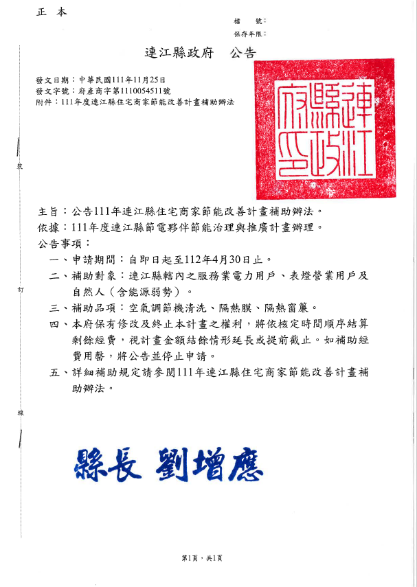 附加PDF文件檔: matsu-67347beada3b2b3a27f3e8be75486d1f.pdf111年度連江縣住宅商家節能改善計畫補助辦法