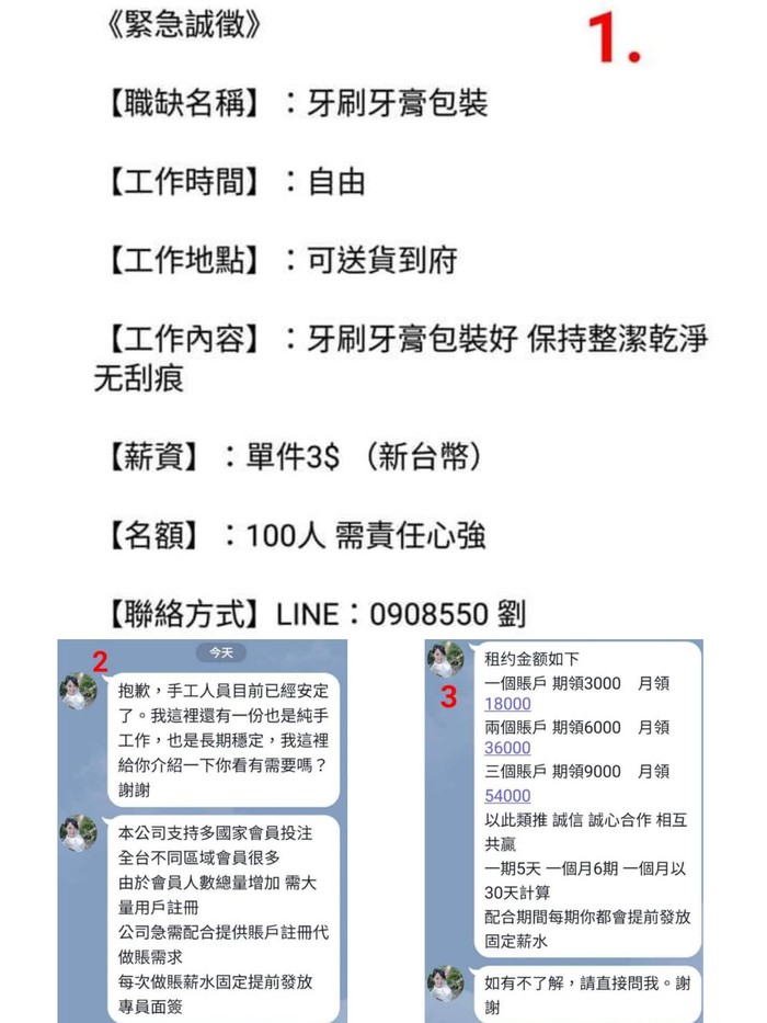 記得..詐騙集團不是要您做手工,詐騙集團會另外安排給你「不用做」就可以「賺大錢」的訊息,記得帳號不要出借,除非您很喜歡跑法院。莒光警察所東莒派出所關心您!