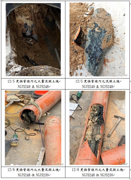 本次緊急開挖工程自12/5日起施作,至12/6日止,已完成兩段管線更換,管線內混凝土超過管截面積1/2,剩餘管線內仍含大量混凝土(混凝土入侵且已固化)及異物,為確保該管線能整段順暢,經現場評估後,緊急開挖該段末端,更換污水管線。