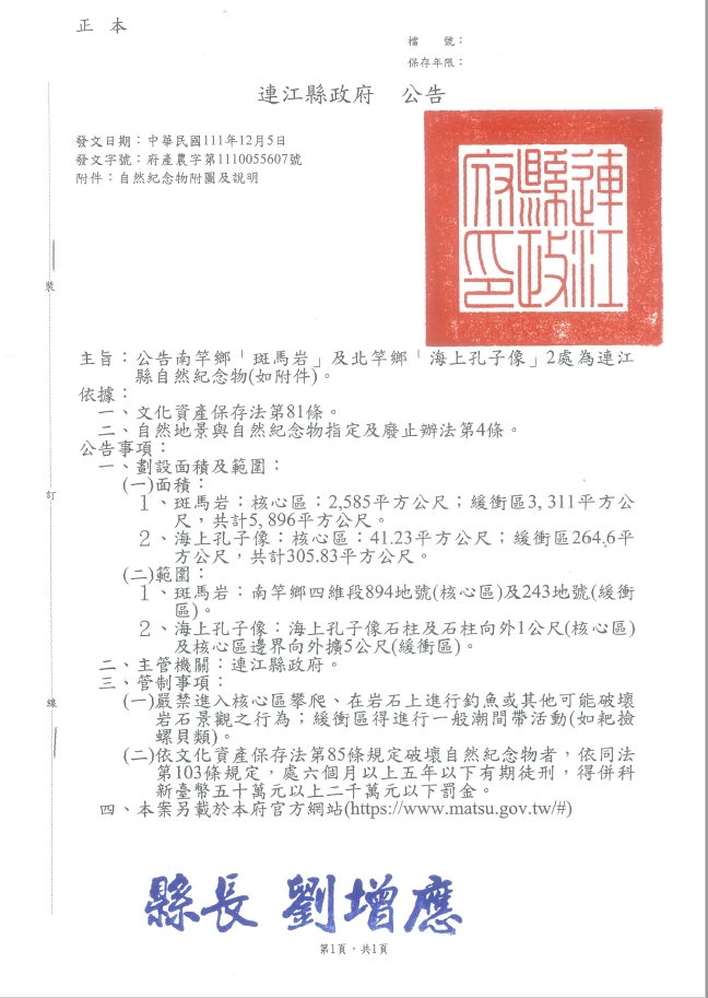 公告南竿鄉「斑馬岩」及北竿鄉「海上孔子像」2處為連江縣自然紀念物