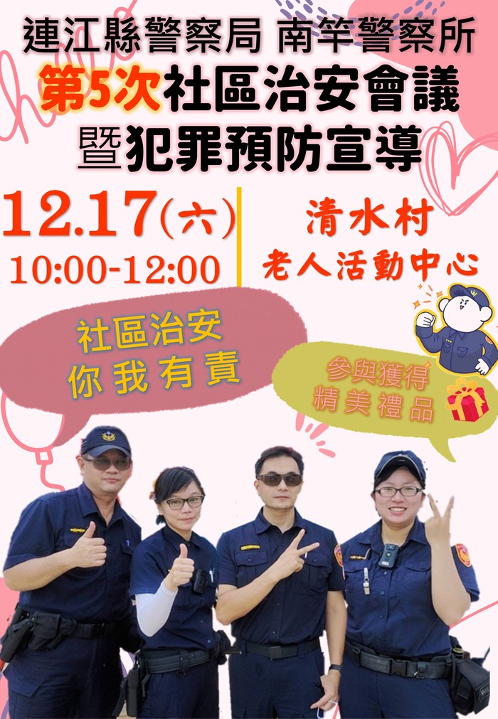 南警所巡迴辦理社區治安會議,即將在12/17(六)前往【清水村】分享犯罪預防、交通安全知識並傾聽居民需求,社區治安你我有責,歡迎各位鄉親一同關心社區安全議題!