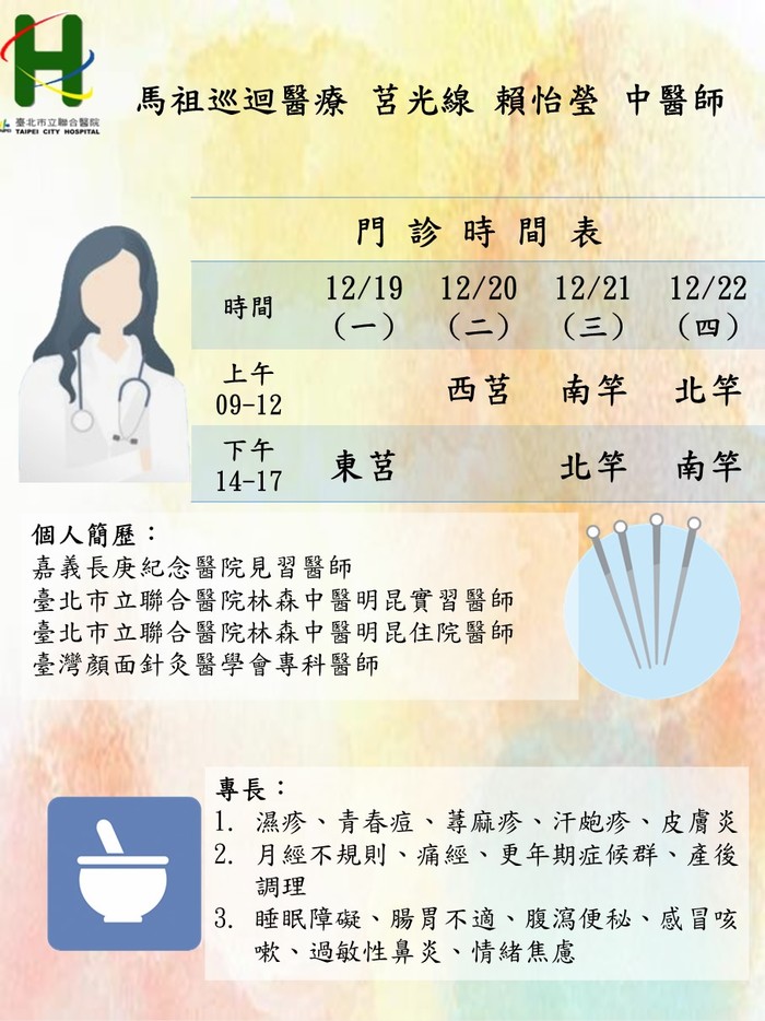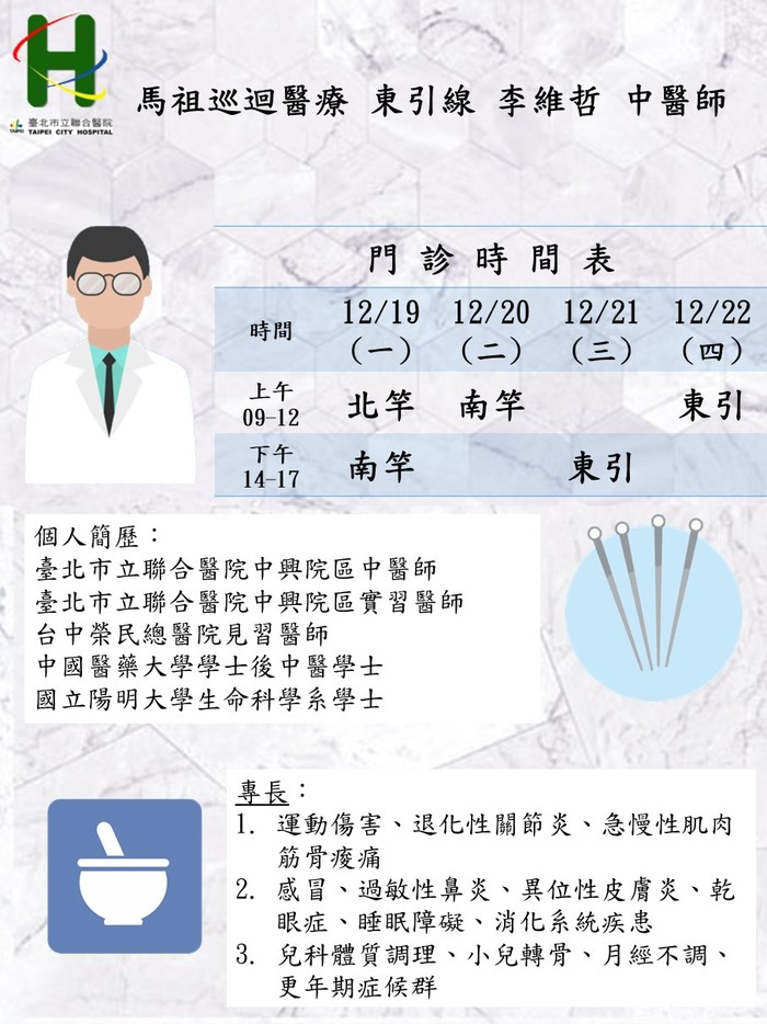 馬祖中醫巡迴醫療111/12/19-12/22 由莒光線 賴怡瑩醫師、東引線 李維哲醫師前往支援服務。
