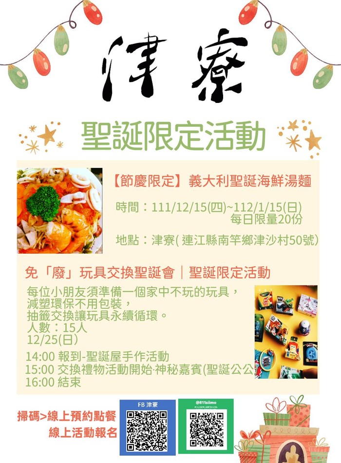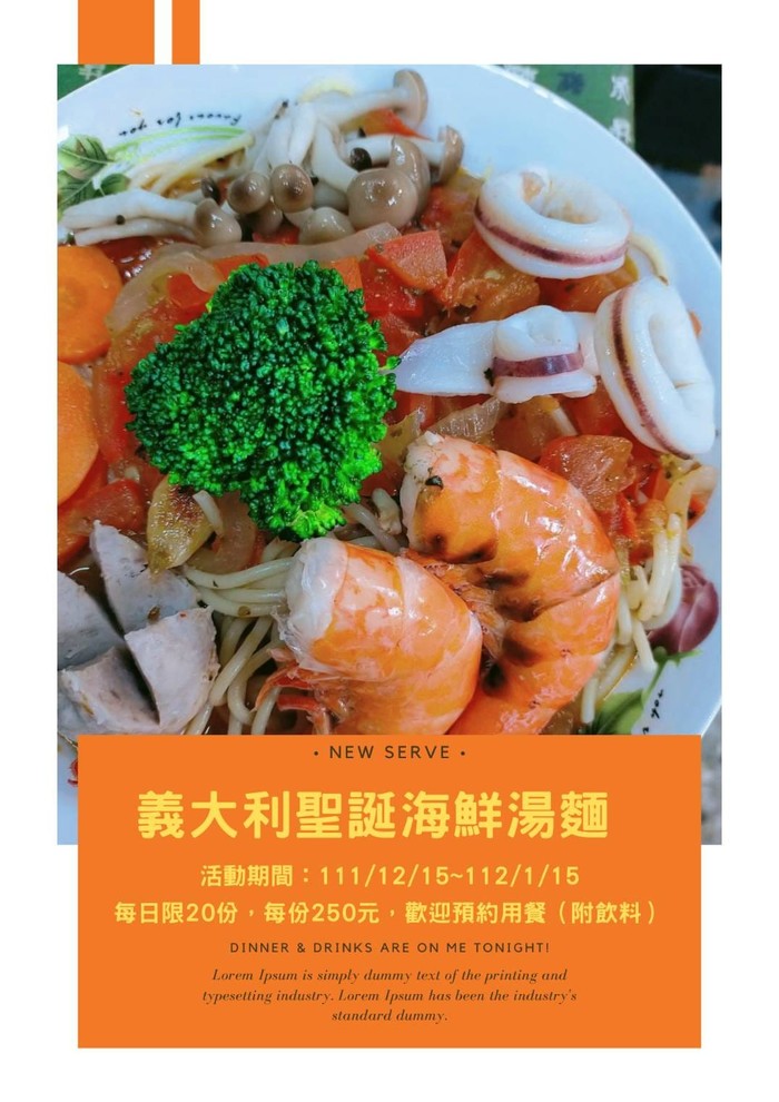 【津寮】聖誕節限定|義大利聖誕海鮮湯麵時間:111/12/15(四)~112/1/15(日) 每日限量歡迎預約