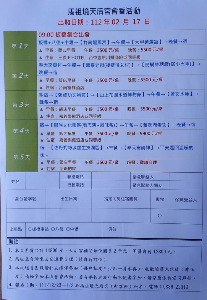 1.本次團費共計14800元,天后宮補助每位團員2千元,團員自付12800元。