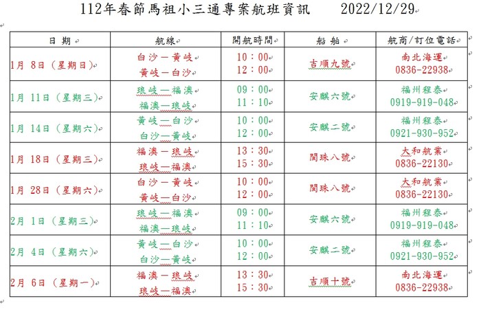 (三)自112年1月1日起,每日上午9時至12時,下午13時30分至16時30分開放訂位,請依附件航班表向所屬航商訂位。