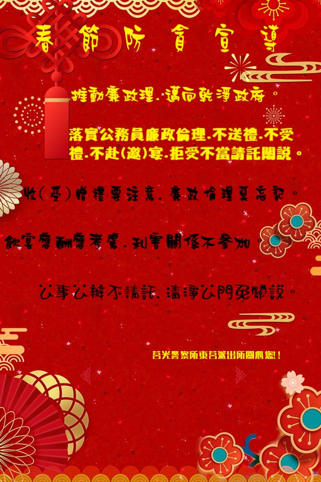 為貫徹公務員廉政倫理規範要求.革除不當受贈財物.飲宴應酬.請託關說等陋習.期間將加強宣導三要觀念:「不受(送)禮.不赴(邀)宴.拒受不當請託關說」.以宣示警察機關革除陋規積習及杜絕紅包文化之決心.籲請民眾響應政府廉能政策。