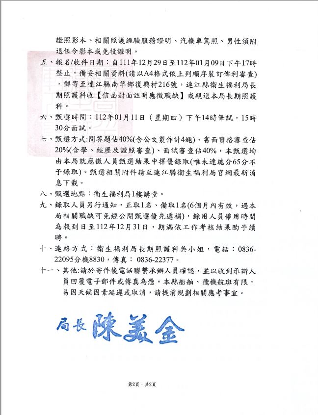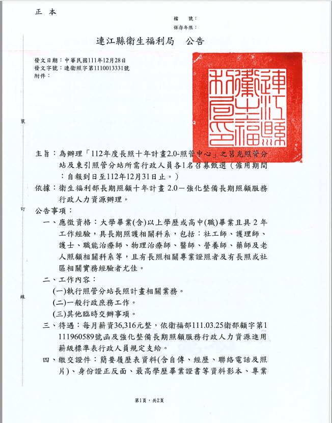 衛福局甄選照管分站行政人員(莒光、東引)2名