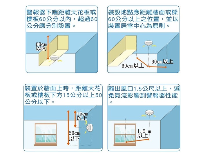 (3)住警器安裝位置需與冷氣、窗戶等通風口保持1.5公尺以上距離。