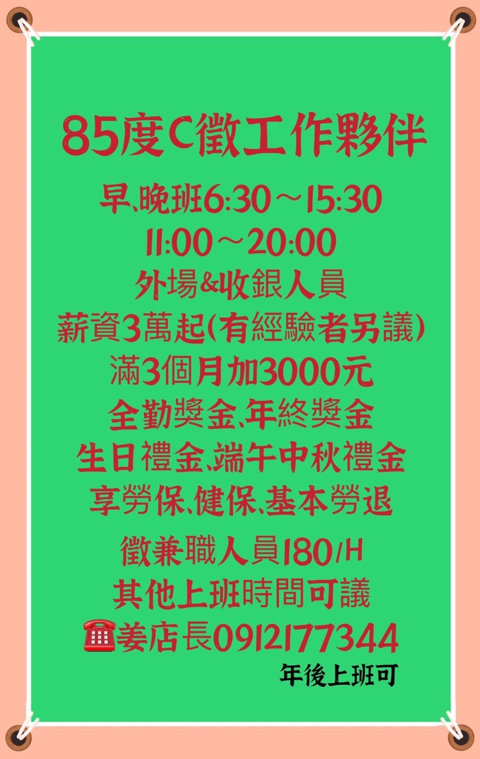 85度C咖啡~誠徵工作夥伴(清水、福沃)