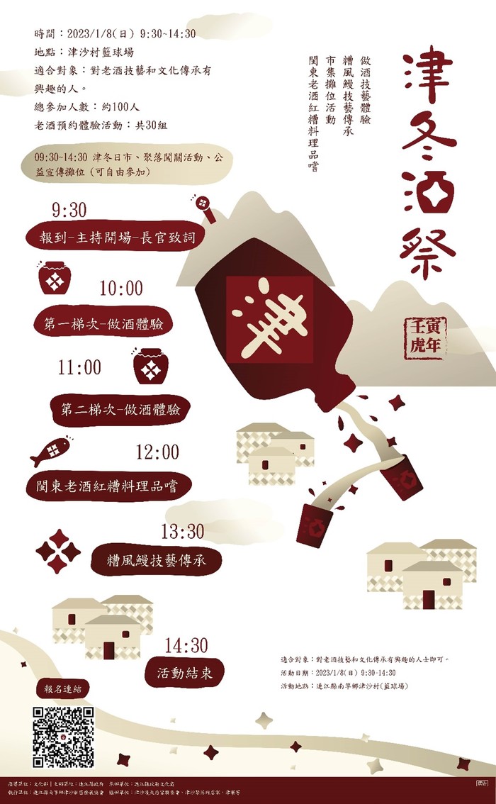 報名期限:2022/12/29~2022/12/31(限津沙村民10位名額)、2023/1/1~2023/1/5(非津沙村民20位名額),共30位 (報名額滿,1/5前將陸續通知報名成功者與候補者資訊)。指導單位:文化部