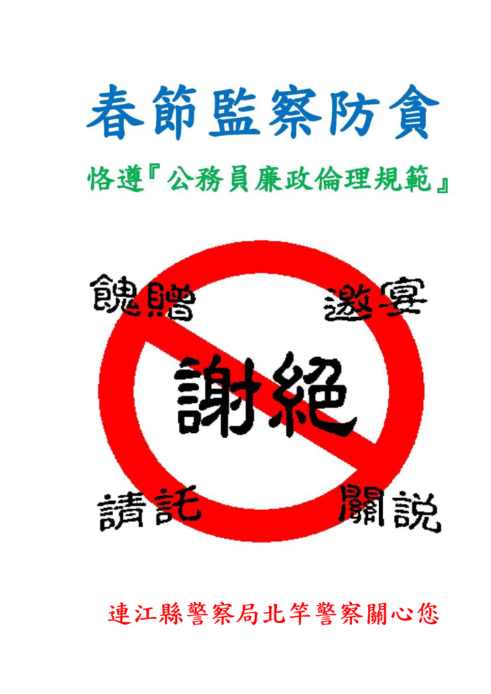 農曆春節將屆,自112年1月10日至1月29日止,為春節監察防貪工作期間,本所已要求同仁不得收受餽贈或接受與職務有利害關係者之邀宴或請託關說,籲請社會各界共同響應「不送禮、不受禮、不赴(邀)宴、拒受不當請託關說」等公務員廉政倫理規範各項規定,共同端正公務員廉潔風紀。