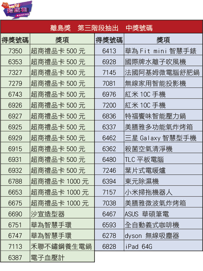 ▲離島獎:超商商品卡500元7350、6353、7327、7279、6743、6926、6927、6925、6929、6915、6931、6932。超商禮品卡1000元6788、6653、6675。沙宣造型器6690。華為智慧手環6751、6747。禾聯不鏽鋼養生電鍋7113。電子血壓計6387。華為Fitmini智慧手錶6413。國際牌水離子吹風機6928。法國阿基姆微電腦舒肥鍋7145。
