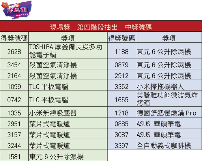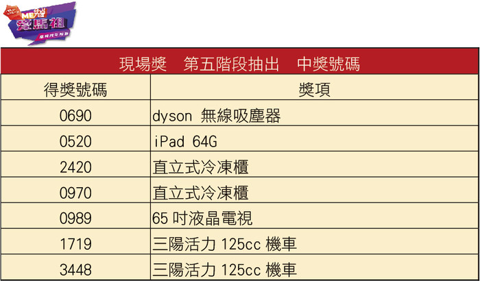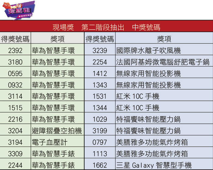 ▲現場獎:超商商品卡500元3098、3467、1262、2038、3941、2025、3493、1509、1678、2286、0597、1631、1632、0555、2191、3262、0515、0627、3076、3050、0605、2519。超商商品卡1000元0978、0721、3423、0862、1277、0985。 華為智慧手環2392、3180、0595、0932、3114、1515、2216。