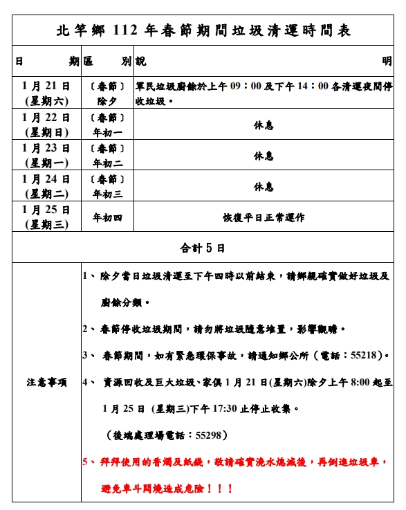 北竿鄉公所通知北竿鄉112年春節期間垃圾清運時間表