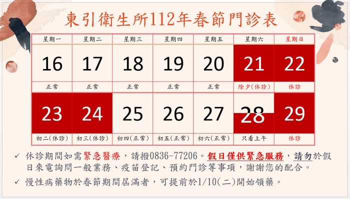 東引衛生所將於除夕(1/21)至初三(1/24)連續休診4日,期間僅提供緊急醫療服務,欲辦理衛生醫療相關業務及開立慢性處方者請即早準備。