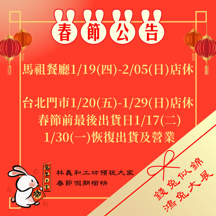 林義和工坊【新年休假資訊】 --閱讀人次 : 594 新年年假即將來臨