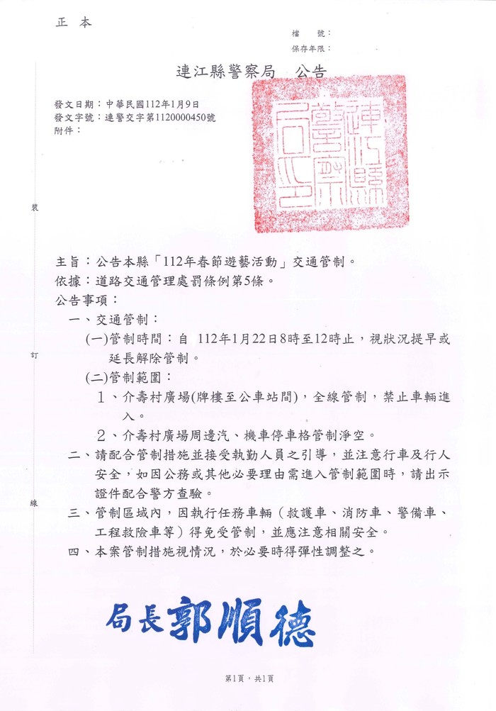 本縣112年春節遊藝活動交通管制公告