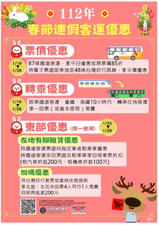 為了鼓勵民眾多家利用大眾運輸工具,公路總局自連假前一日112年1月19日0時起到112年1月29日24時止推出多項全國性共通國道(公路)客運優惠,提供返鄉及出遊旅客選擇,包括客運業者實施87條中長途國道客運路線享平日票價或原票價85折優惠及48條台灣好行路線持電子票證乘車享半價優惠。另外在轉乘優惠部分,舉凡搭乘高鐵、臺鐵及國道客運後10小時內使用電子票證轉乘在地客運均可享有1段票(或基本里程)免費優惠。另外針對前往臺灣東部區域民眾,享有「在地有腳」租賃優惠,搭乘指定東部國道客運路線享租車優惠,回程持租賃汽機車憑證享國道客運車票優惠(租汽車者折抵200元,租機車者折抵100元),而持東部合法旅宿業住宿憑證或台灣好行套票,搭乘東部國道客運享4人同行1人免費,回程再折抵200元。(與在地有腳租賃優惠擇一使用)