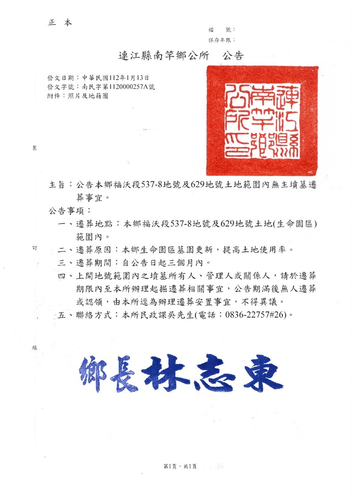 南竿鄉福沃段無主墳墓遷葬公告