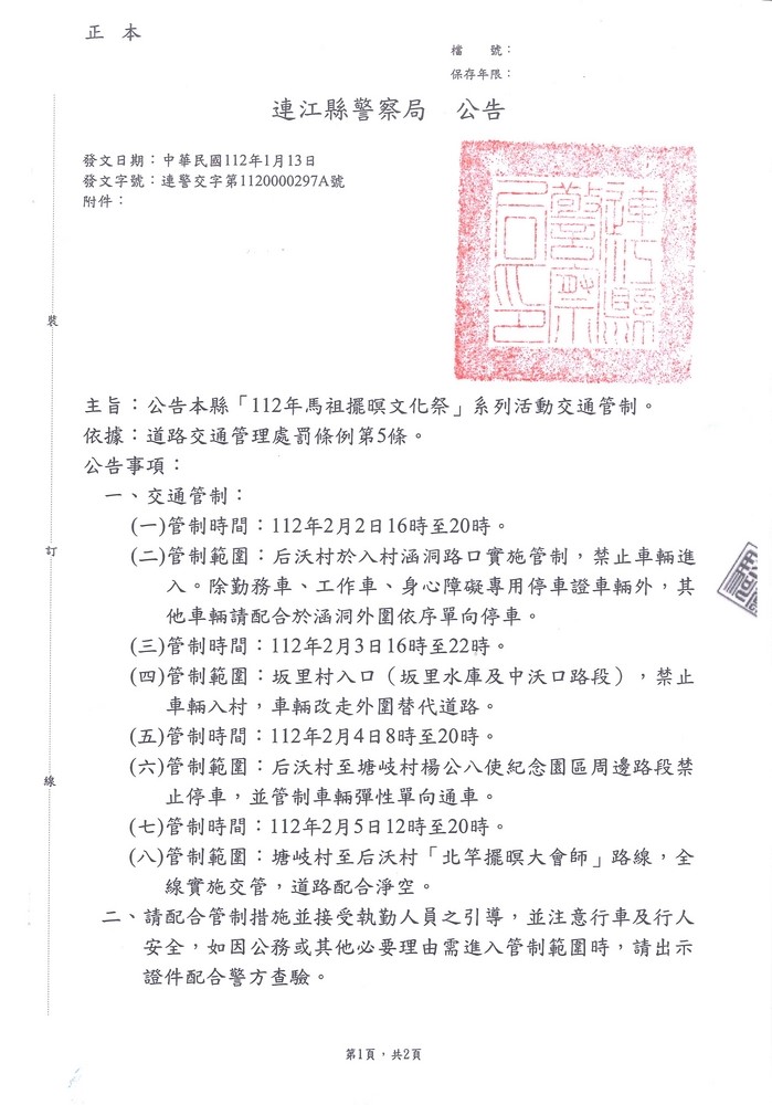 112年馬祖擺暝文化季交通管制公告