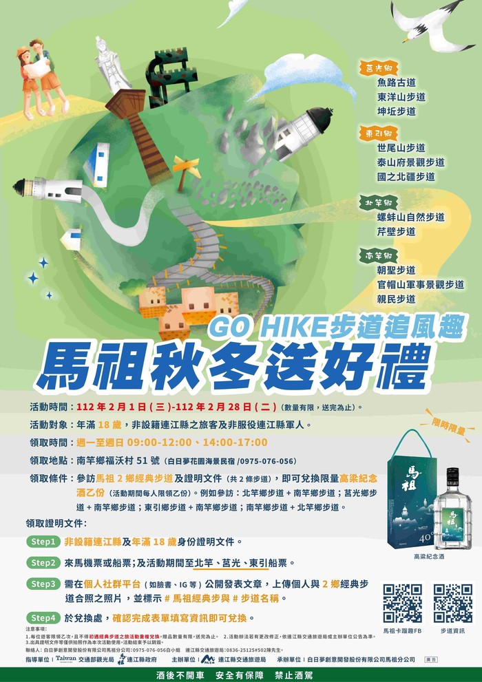 ★領取條件:參訪馬祖2鄉經典步道及證明文件(共2條),即可兌換限量版馬祖高梁紀念酒乙份。