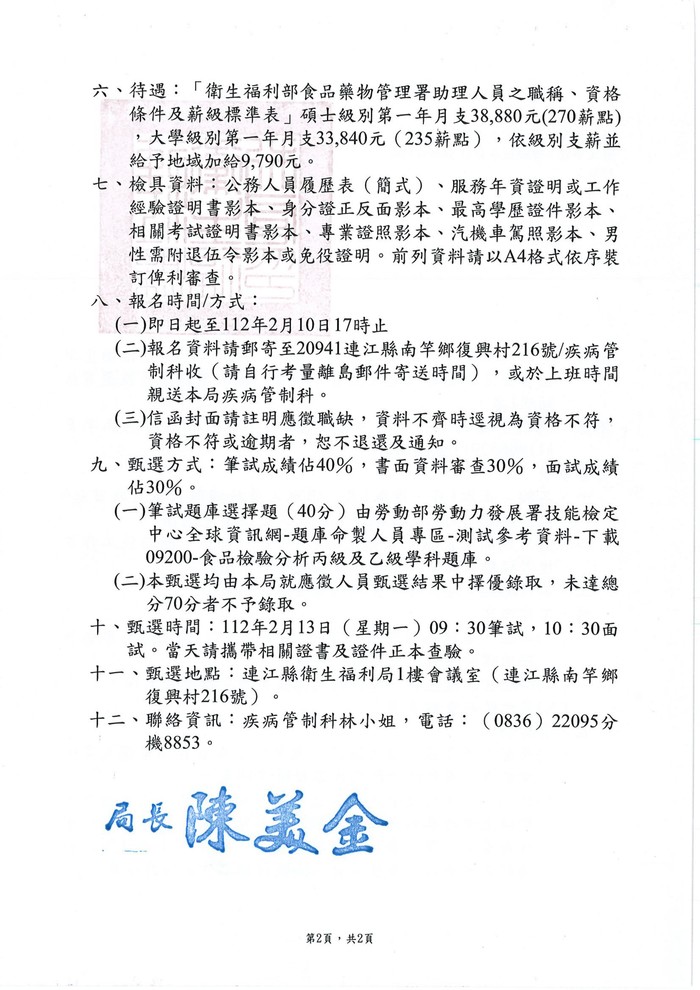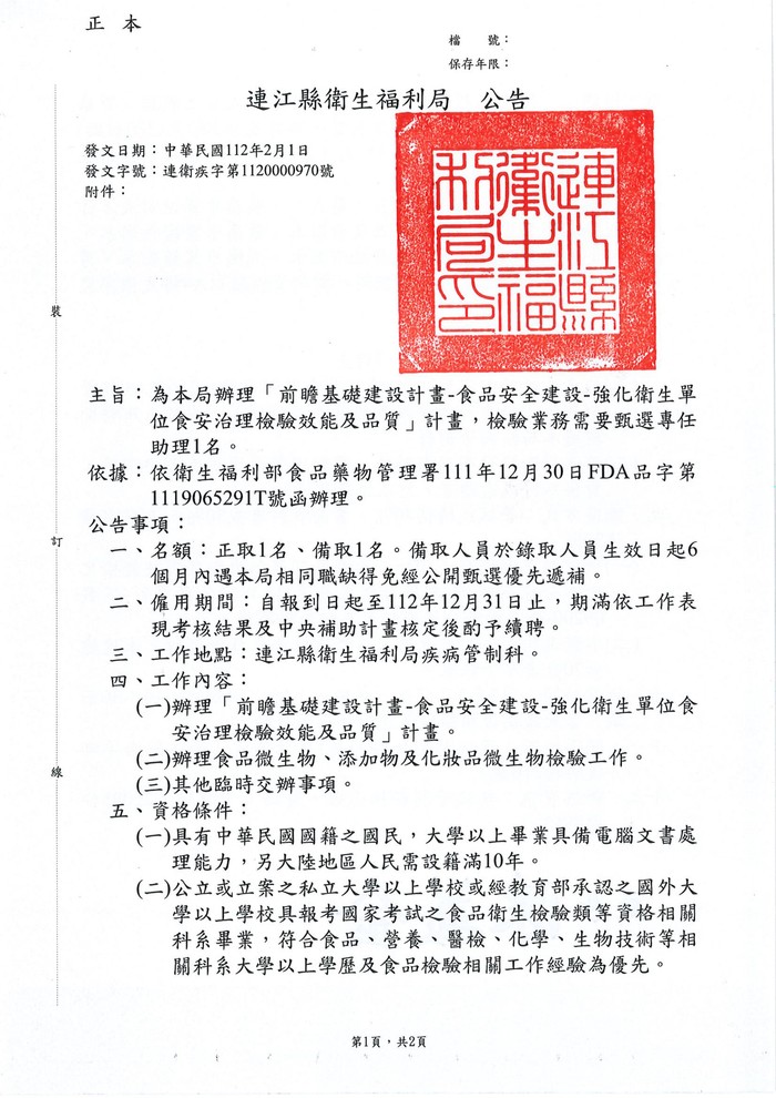 衛福局甄選「強化衛生單位食安治理檢驗效能及品質」專任助理1名