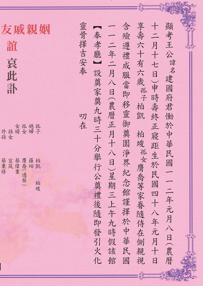 顯考王公建國慟於民國112年元月8日壽終正寢,享壽六十有六歲。謹擇於民國112年2月8日星期三上午9時於桃園市中壢區御奠園淨界紀念館奉孝廳舉行家祭,9時30分舉行公祭。