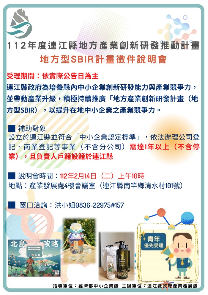 為有效輔導及提升地區產業升級,將辦理112年度連江縣「地方產業創新研發推動計畫(地方型SBIR)」說明會,欲申請本計畫之業者請踴躍出席!』。