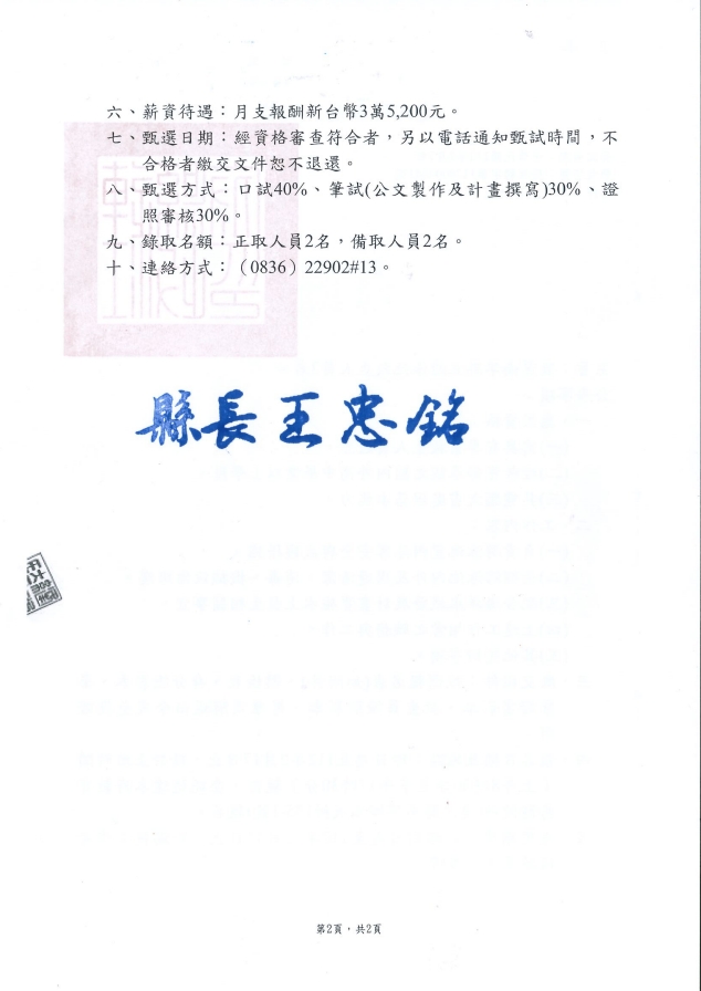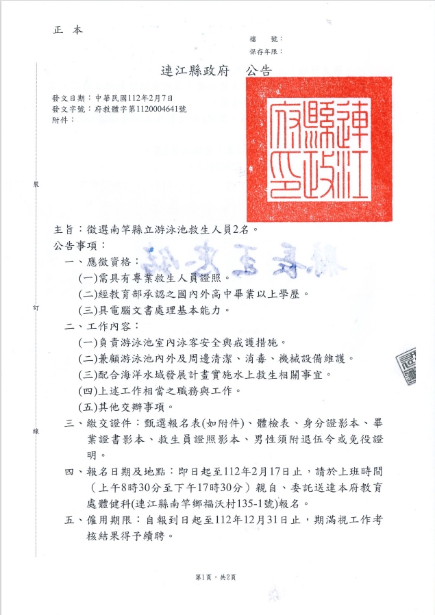 甄選南竿縣立游泳池救生人員2名(第二次公告)