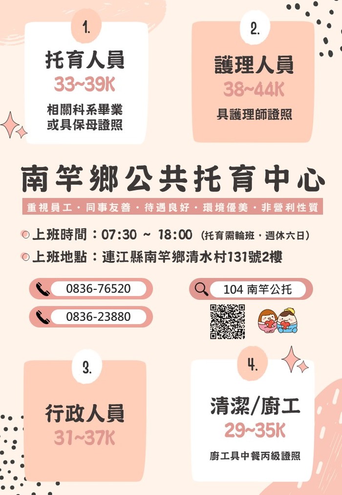南竿公托誠徵托育人員、護理師、行政人員、廚工人員、清潔人員,