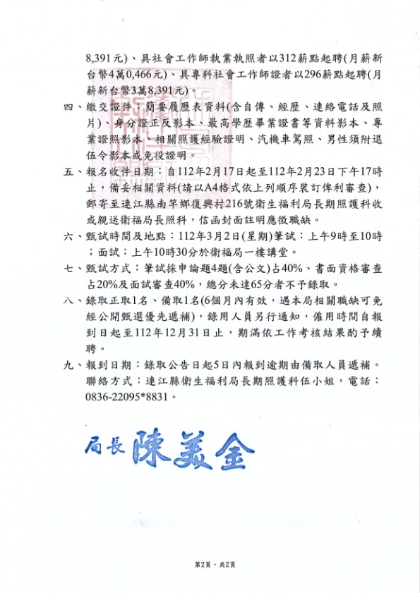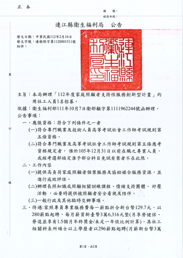 衛福局招募家照者創新計劃社工1名公告
