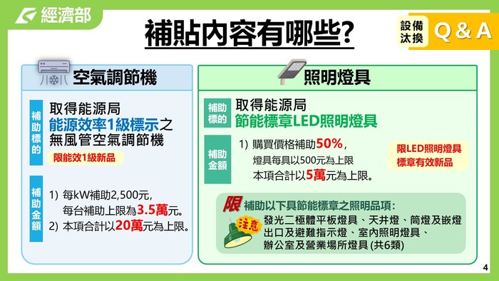 1.節能設備汰換:對象為所有服務業業別(批發零售、住宿餐飲及商業服務業等),補助包含空調設備及照明設備二項。