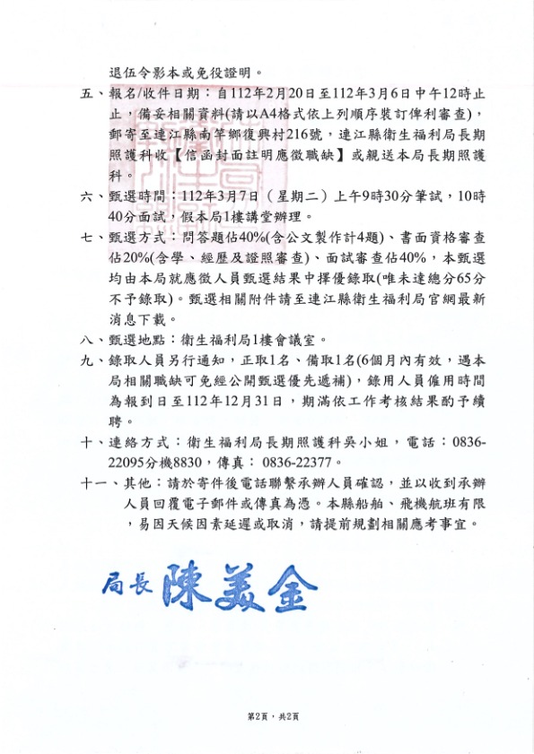 衛福局甄選莒光照管分站行政人員1名