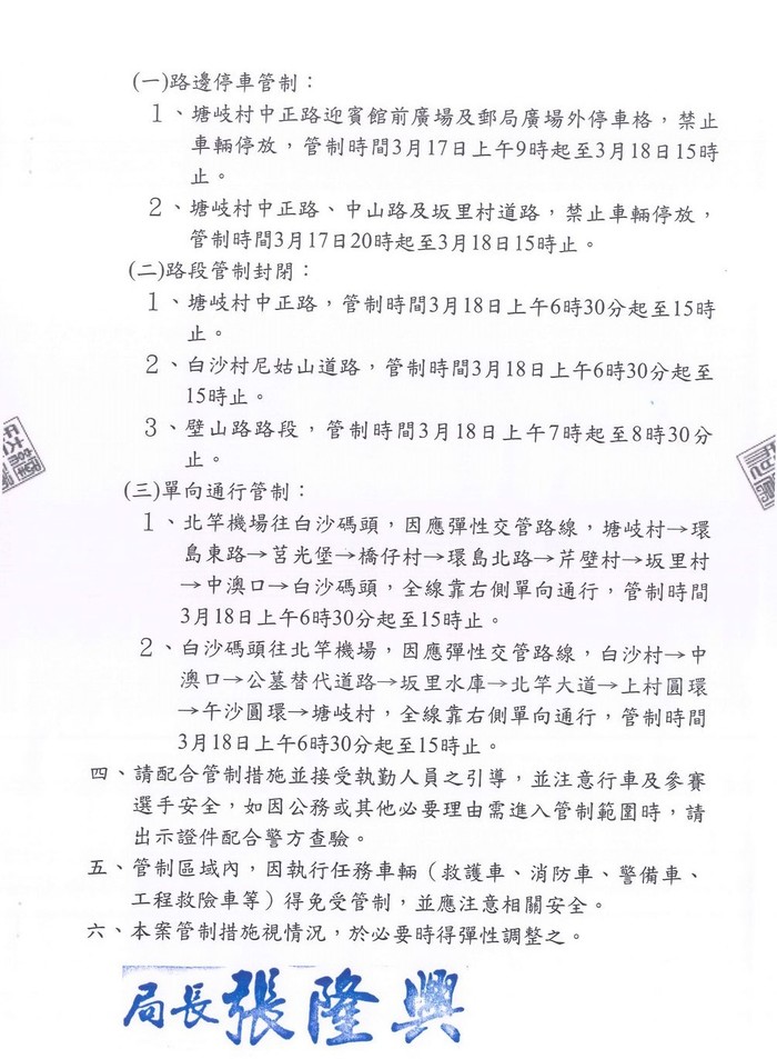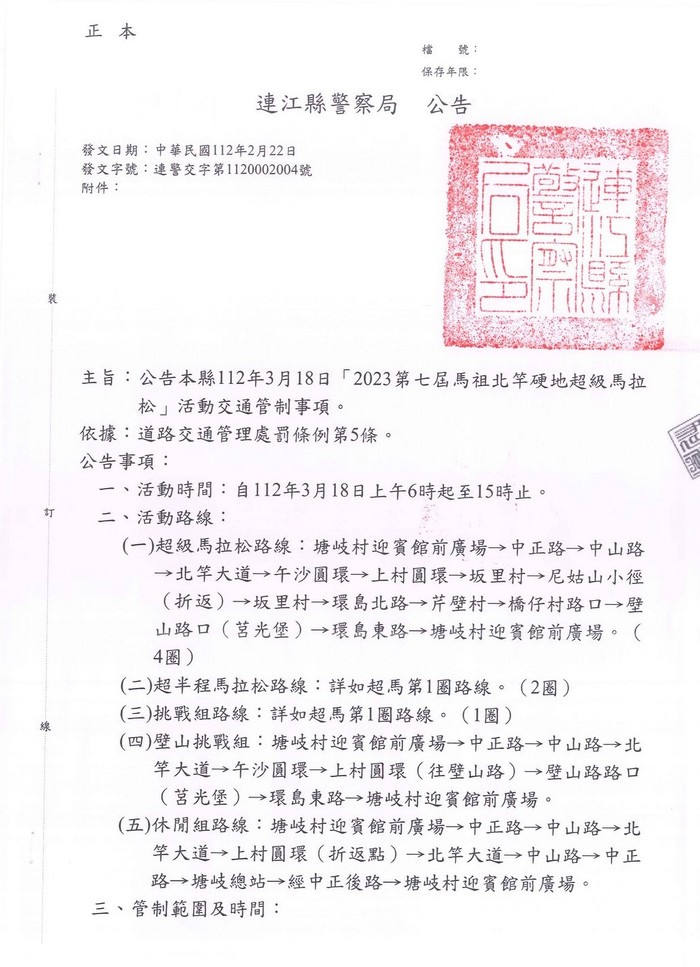 2023第七屆馬祖北竿硬地超級馬拉松交通管制公告