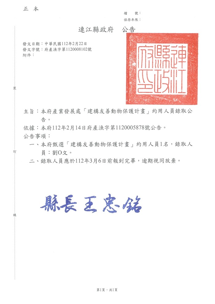 連江縣政府甄選「建構友善動物保護計畫」約用人員錄取公告