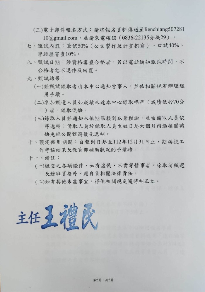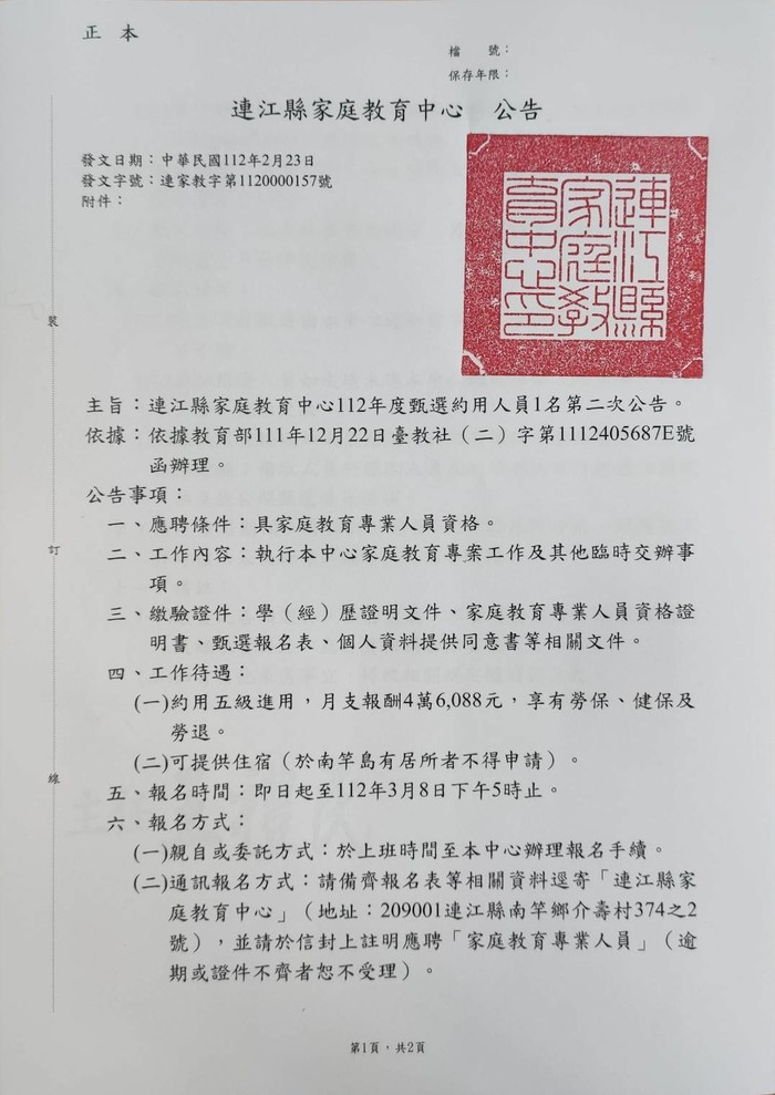 連江縣家庭教育中心112年度甄選約用人員1名第二次公告