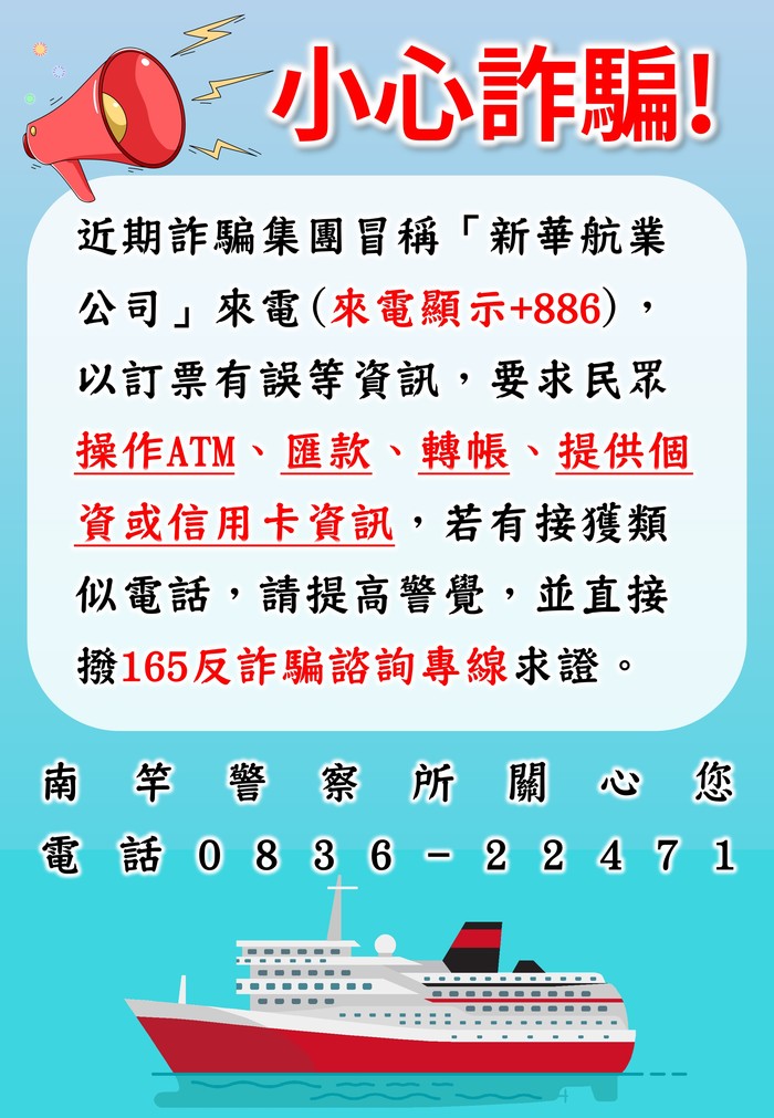 近期詐騙集團冒稱「新華航業公司」來電(來電顯示+886),以訂票有誤等資訊,要求民眾操作ATM、匯款、轉帳、提供個資或信用卡資訊,若有接獲類似電話,請提高警覺,並直接撥165反詐騙諮詢專線求證。