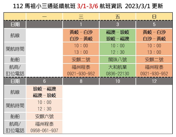 原排定112年3月5日南北海運股份有限公司所屬「吉順9號」執行白沙往返黃岐小三通航班,因船舶返台歲修,航班修正改由程泰船務有限公司所屬「安麒2號」執行黃岐往返白沙,修正後航班表如下,訂位電話請洽886-921-930-952。