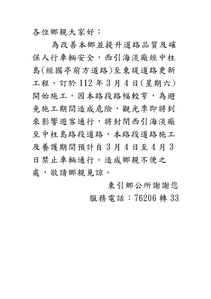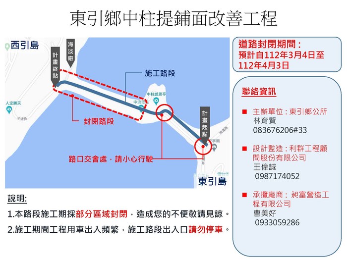東引中柱島經國亭至海淡廠工程道路封閉