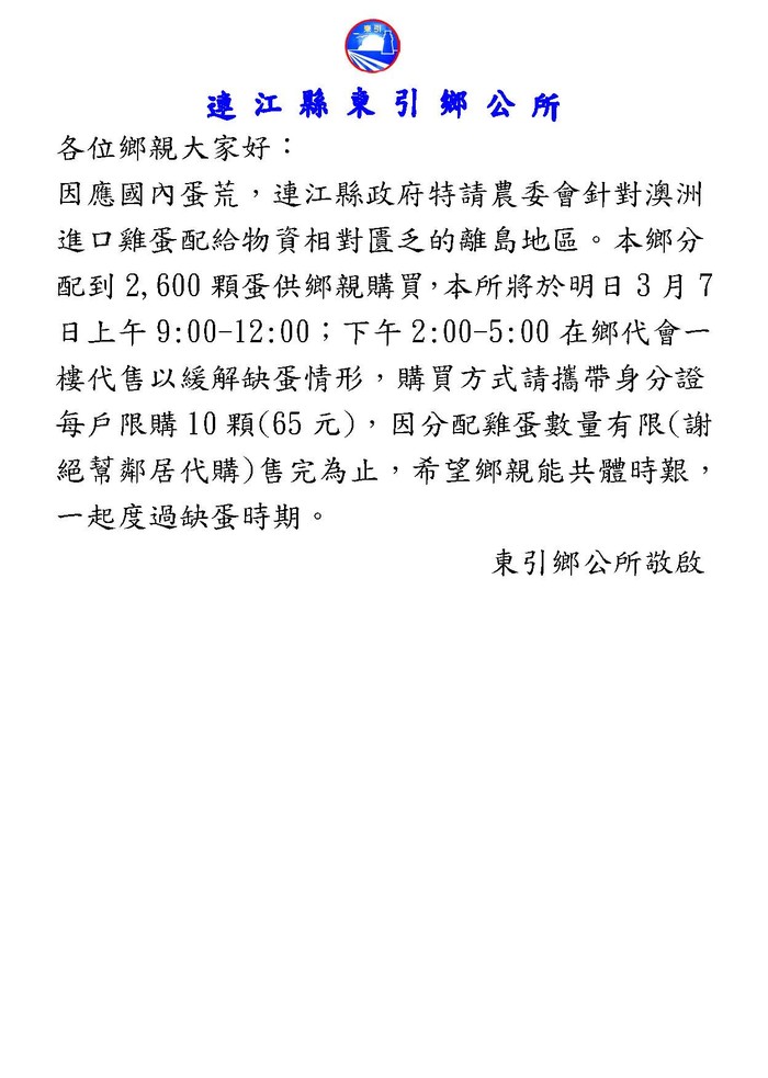 因應國內蛋荒,連江縣政府特請農委會針對澳洲進口雞蛋配給物資相對匱乏的離島地區。本鄉分配到2,600顆蛋供鄉親購買,本所將於明日3月7日上午9:00-12:00;下午2:00-5:00在鄉代會一樓代售以緩解缺蛋情形,購買方式請攜帶身分證每戶限購10顆(65元),因分配雞蛋數量有限(謝絕幫鄰居代購)售完為止,希望鄉親能共體時艱,一起度過缺蛋時期。