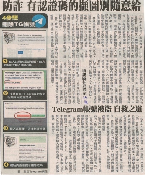 防詐騙,使用TG帳號勿擷圖給他人 --閱讀人次 : 1185 近期發現有不少民眾的Telegram帳號遭盜用,而且他們都不知道自己成為受害者,詐騙集團只要取得民眾之行動電話號碼,再取得認證碼的擷圖,就可以盜用帳號。詐騙集團會表示自己的頁面會出現同樣的兩個帳號,要民眾擷圖(認證碼)並回傳畫面,以確認民眾也有相同問題,只要你傳給詐騙集團,自己的帳號就會被盜用,警察局呼籲民眾,以下有方法刪除自己的Telegram帳號: