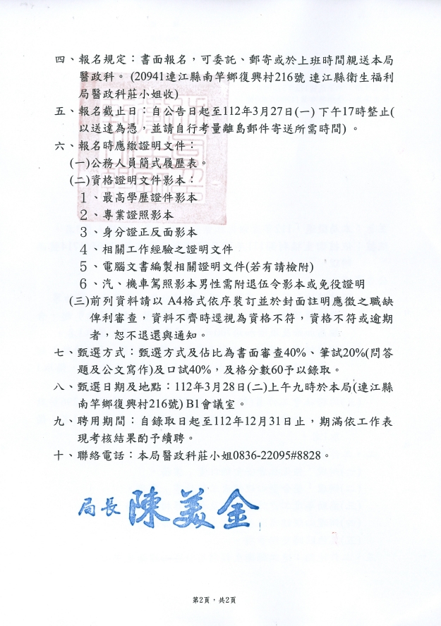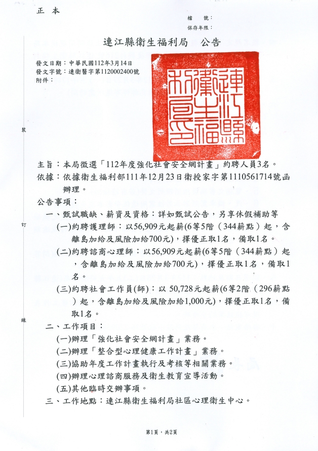 連江縣衛福局招募「社會安全網計畫」約聘人員3名