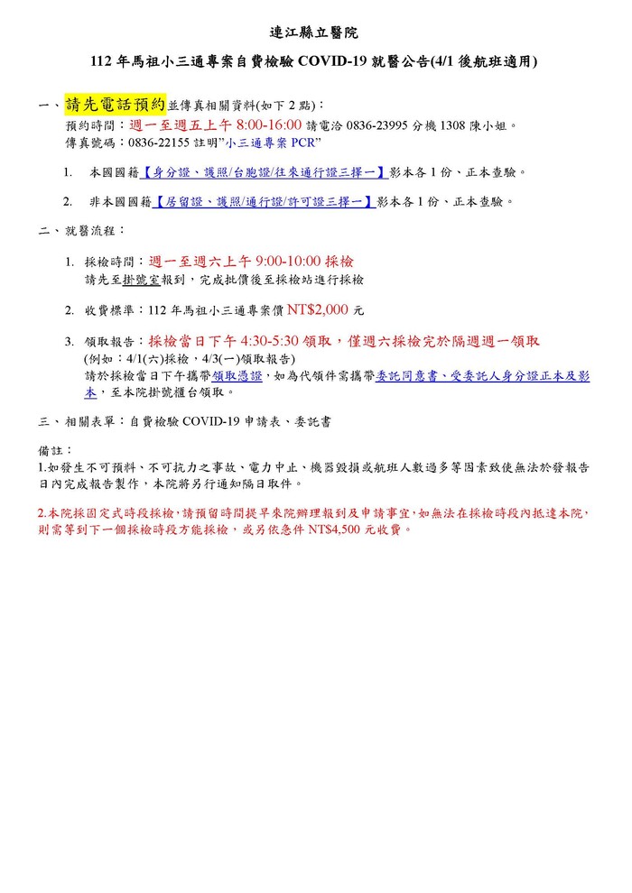 縣醫4/1起小三通自費PCR檢驗公告 --閱讀人次 : 2233