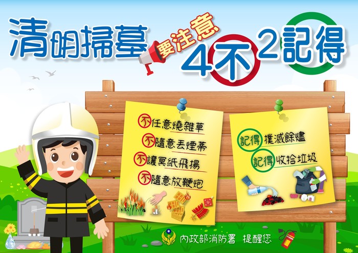 北竿消防隊宣導清明防火注意事項 --閱讀人次 : 460 清明防火其實並不是⼀件困難的事,只要你牢記「4不2記得」⼝訣: