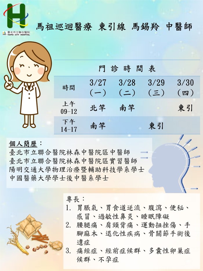馬祖中醫巡迴醫療112/3/27-3/30由莒光線 陳煒達醫師、東引線 馬錫羚醫師前往支援服務。
