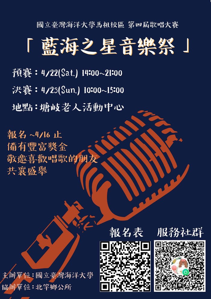 今年的比賽取名為「藍海之星歌謠季」,4/22~4/23於北竿鄉塘岐老人活動中心舉行,希望大家可以歌聲中度過美好的週末