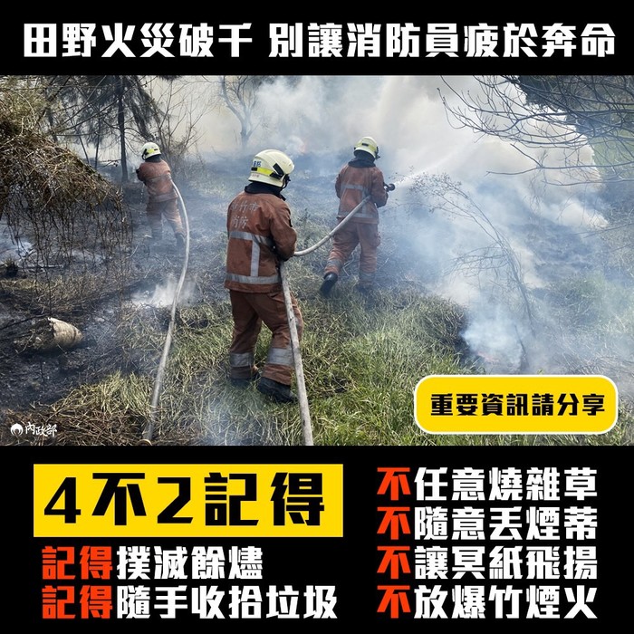 傳統習俗中清明掃墓的季節又到了,為避免因為燒冥紙或燃放鞭炮造成的山林火災,本分隊呼籲民眾祭祖掃墓,請注意「四不二記得」的口訣,避免火災發生;本分隊於假日將派遣消防車巡邏各公墓,亦有提供用水給需要的民眾取用,最後敬祝鄉親身體健康,萬事如意。