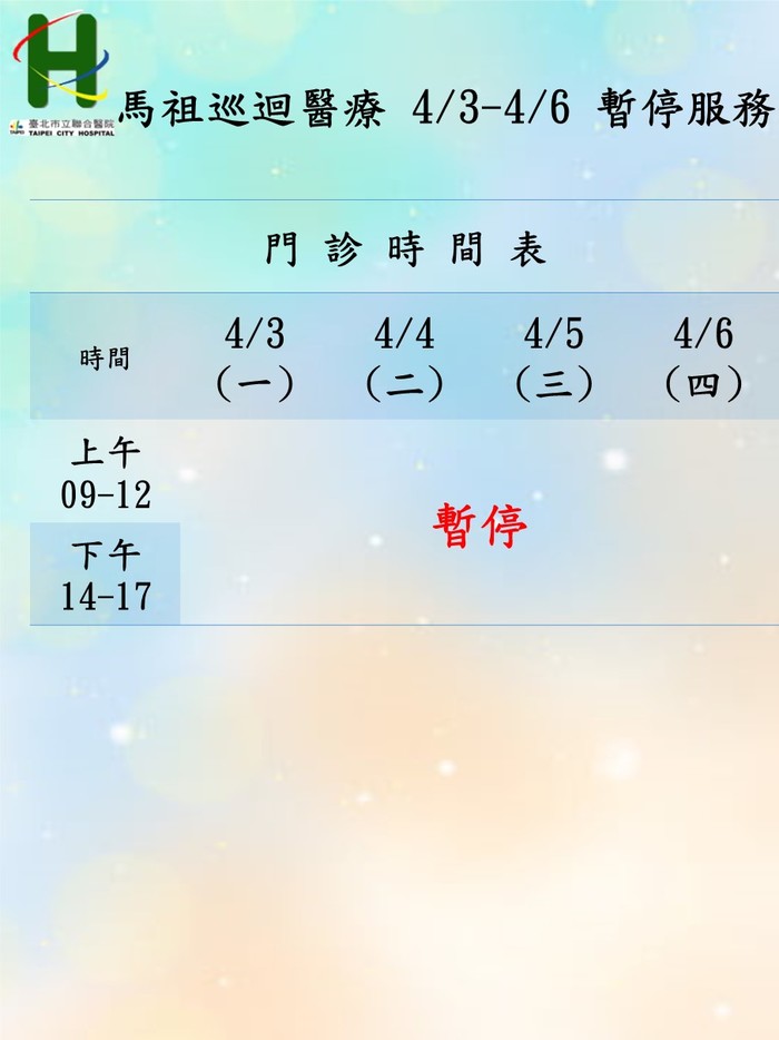 馬祖中醫巡迴醫療112/4/3-4/6因國定假日暫停服務。